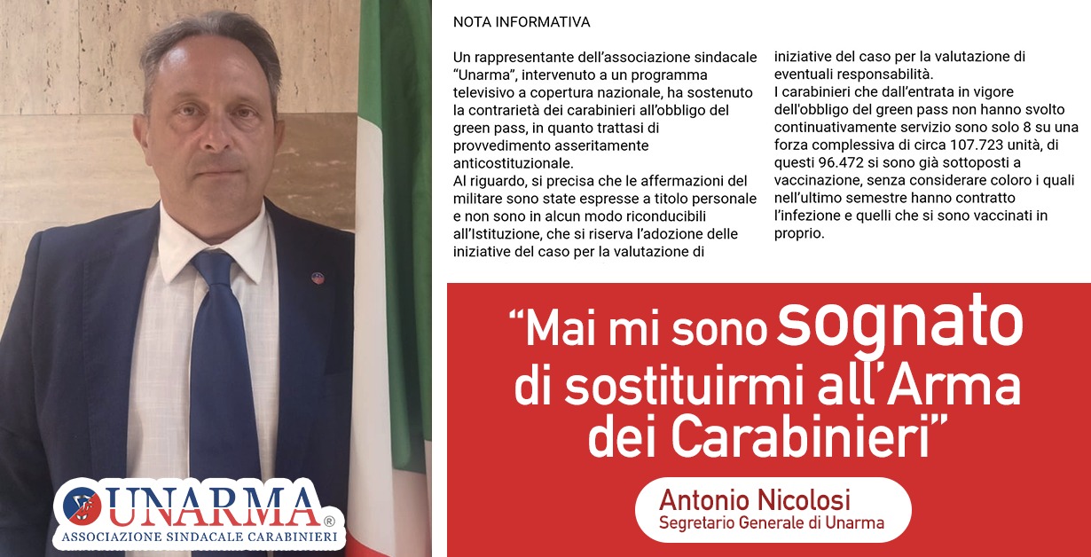 “Leggo con stupore e amarezza la nota inviata dal Comando Generale dell’Arma da cui si evince una scorretta interpretazione del mio intervento di ieri nella trasmissione televisiva di La7 L’Aria che Tira; un’interpretazione non conforme a quanto da me dichiarato nel corso della stessa” così in una nota Antonio Nicolosi, Segretario Generale del Sindacato dell’Arma dei Carabinieri Unarma. “Come militare e Segretario Generale della più antica associazione sindacale dell’Arma” continua Nicolosi “non ho mai espresso contrarietà alla vaccinazione, ma all’imposizione del green pass che la nostra associazione – così come altre – considera incostituzionale e fortemente discriminatorio. Non mi sono altresì mai permesso di parlare a nome dell’istituzione dell’Arma, baluardo che servo con onore e gratitudine da tutta la vita. Il mio dovere resta, tuttavia, quello di tutelare, rappresentare e dare voce a quei carabinieri che faticano a farsi sentire dai decisori: migliaia di donne e uomini che oggi vivono una situazione drammatica perchè contrari al vaccino. Come Carabiniere” conclude Nicolosi “ho giurato di servire la nostra Costituzione, incluso quel principio democratico di libertà di pensiero e di espressione, per la cui affermazione continuerò a spendermi senza retrocedere di un solo centimetro, nell’interesse di ogni militare che ho l’onore di rappresentare”.