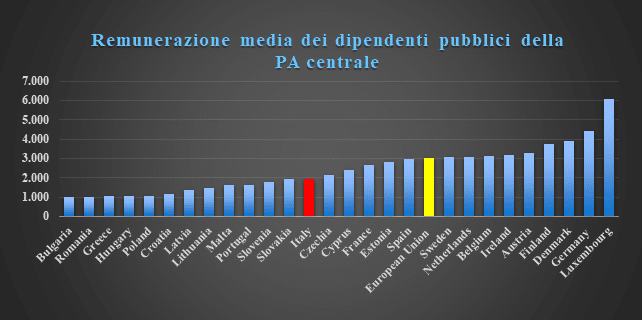 L’Italia con una retribuzione media mensile di € 1.953 si piazza al 15° posto tra i 27 Paesi dell’Unione Europea, non esattamente un risultato esaltante considerando che il Belpaese ha il 3° PIL comunitario. Gli statali italiani guadagnano circa € 1.100 in meno della media europea (€ 3.024) ed addirittura percepiscono uno stipendio inferiore di € 4.100 rispetto ai colleghi del Lussemburgo che sono i più remunerati (€ 6.057).