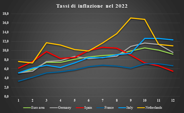 L’Italia, che nel mese di dicembre presenta il tasso di inflazione più alto dei Paesi presi in esame, ha registrato una crescita costante e sostenuta dei prezzi per tutto l’anno, con una lieve flessione (-0,3%) nell’ultimo mese. L’indice dei prezzi al consumo a fine anno è stato superiore del 3% della media dell’area euro (verde) ed addirittura di 6,8 punti percentuali rispetto alla Spagna (rossa).