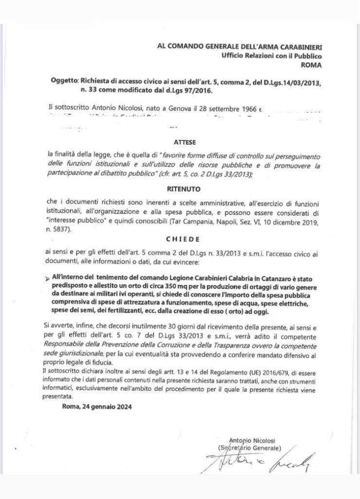 RICHIESTA DI ACCESSO CIVICO AL COMANDO GENERALE DELL’ARMA DEI CARABINIERI